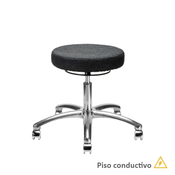Banco giratorio, asiento redondo de espuma de poliuretano tapizado, mecanismo de ajuste neumático de altura, base de 5 anclas con regatones o rodajas.