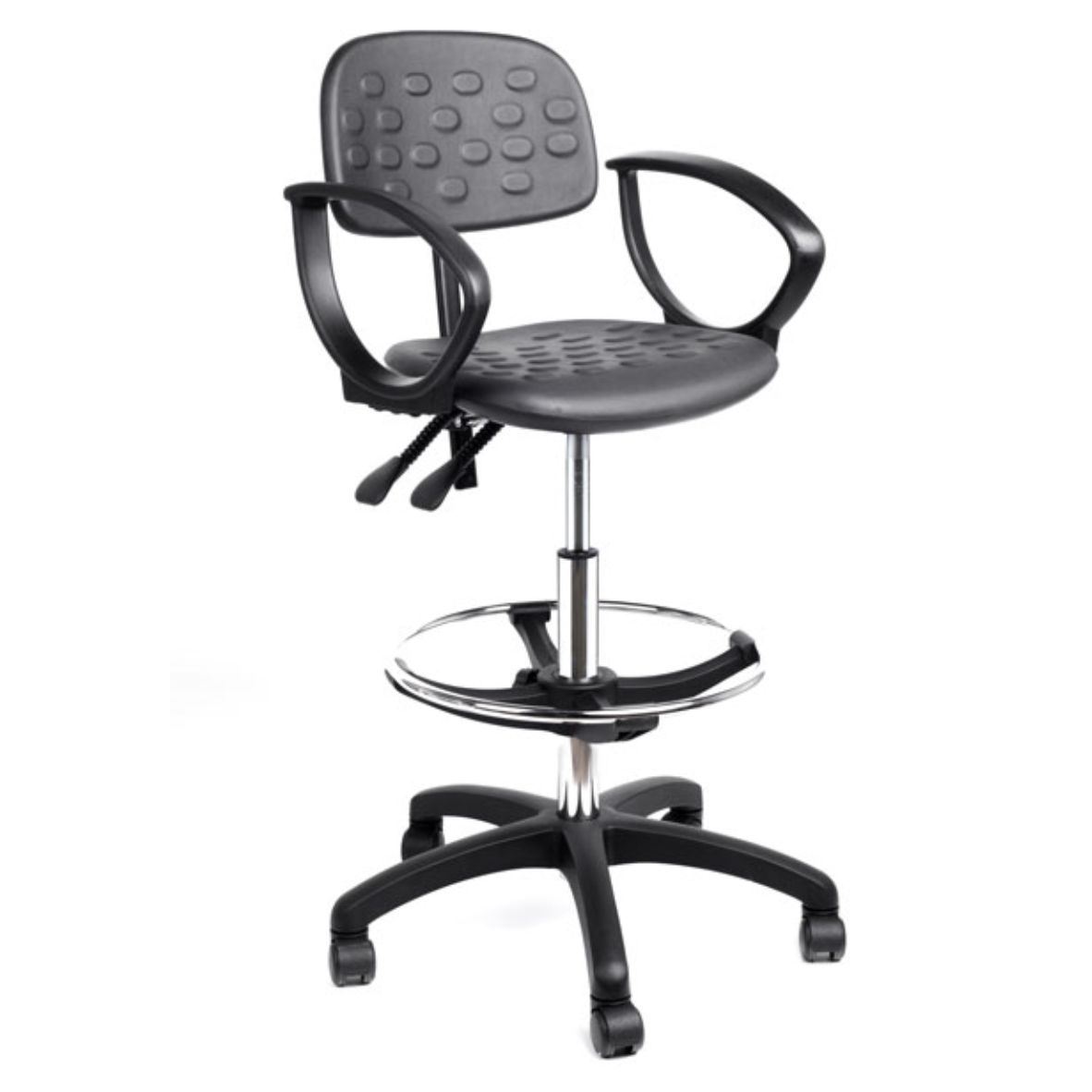 Silla giratoria, respaldo y asiento moldeados de poliuretano piel integral, mecanismo de reclinación de respaldo, ajuste neumático de altura; base de 5 anclas con regatones o rodajas, con coderas de poliuretano con alma de acero, aro descansapies.