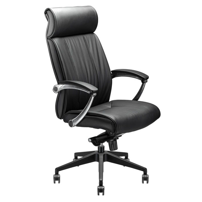 Sillón director TOP SIT respaldo alto con coderas fijas, giratoria, ajuste neumático de altura de asiento acojinado moldeado en asiento y respaldo tapizado en piel/curpiel, reclinación tipo rodilla con bloqueo en 5 posiciones, ajuste de tensión de reclinación, dispositivo de seguridad contra «disparo» de respaldo, coderas fijas de aluminio pulido y poliuretano, base negra de araña de 5 brazos, rodajas alfombra de Ø 65 mm, peso neto de la silla 21 kg