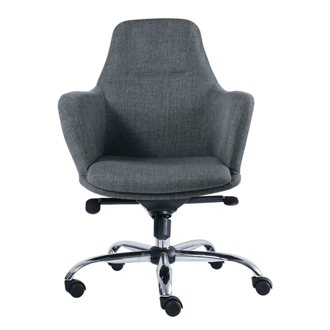 ejecutivo alto fabricado en estructura tipo concha con brazos, base cromada , mecanismos de rodilla syncro con 5 posiciones de bloqueo. tapizado