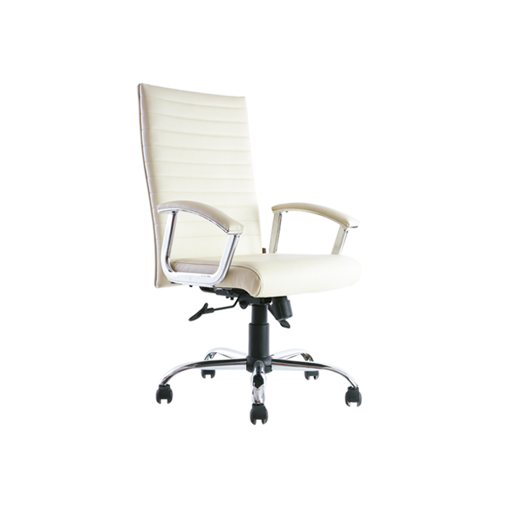 silla ejecutiva de respaldo alto, con mecanismo ejecutivo syncro con bloqueo, tapizado a rayas horizontales en respaldo , brazos en acero cromado con pad tapizado , estructura de madera domada , base de 5 puntas terminada en cromo