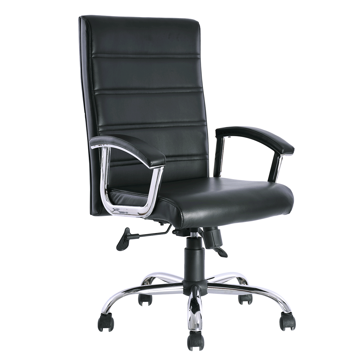 silla ejecutiva de respaldo alto, con mecanismo ejecutivo syncro con bloqueo, tapizado a rayas horizontales en respaldo , brazos en acero cromado con pad tapizado , estructura de madera domada , base de 5 puntas terminada en cromo