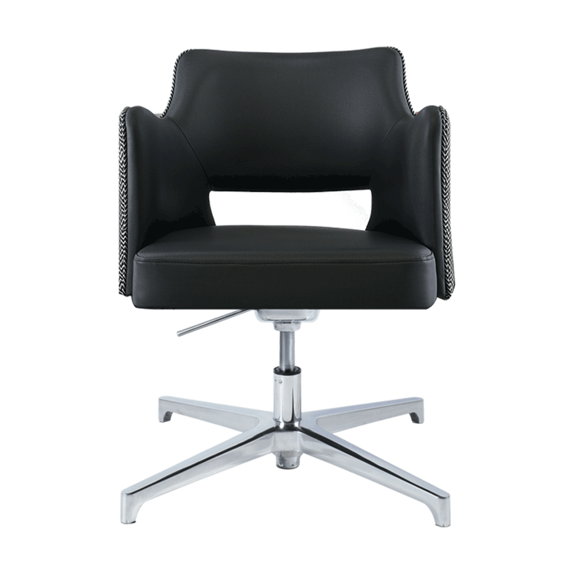silla de espera tipo concha, fabricado en madera domada en respaldo y madera laminada en asiento , poliuretano inyectado en asiento , tapizado en tela , mecanismo giratorio de aluminio con palanca para ajustar la altura , base de aluminio de 4 puntas