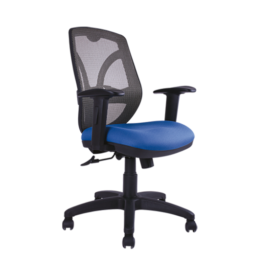 sillón operativo de respaldo medio, respaldo tapizado en malla Flex o malla heavy Flex, opcional en 4 colores, soporte lumbar, asiento en poliuretano inyectado y tapizado en tela, brazos ajustables de gel con poliuretano, mecanismo syncro de dos palancas con bloqueo, base de nylon color negro con rodajas de 50 mm