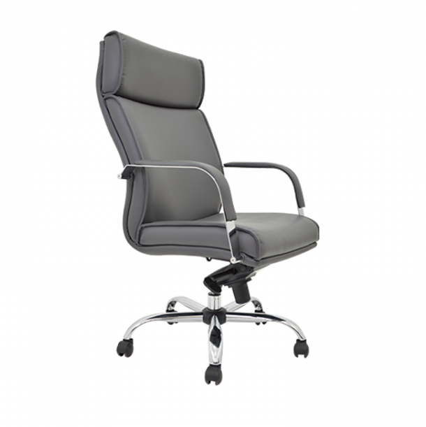 ejecutivo respaldo alto, base cromada, brazo en solera de acero terminada en cromo con pad tapizado, mec. rodilla con 5 posiciones de bloqueo