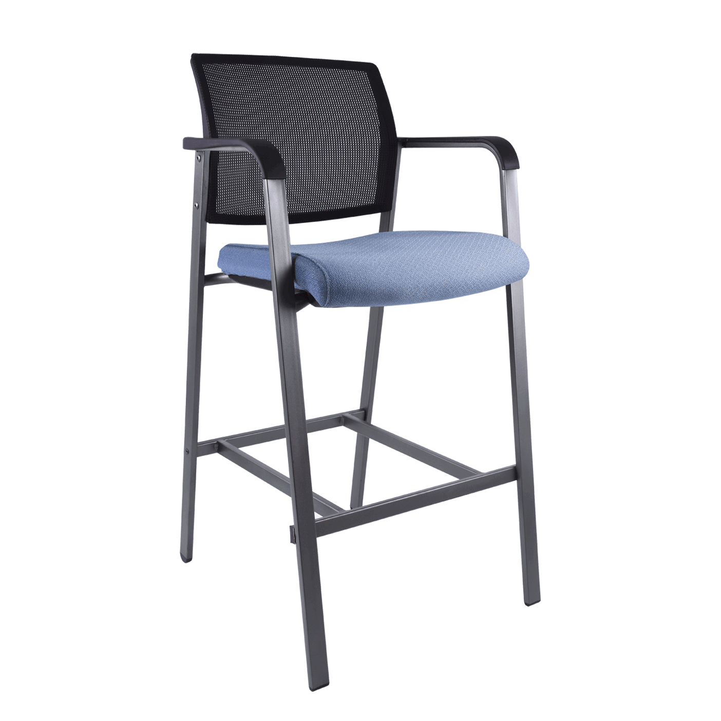 banco alto fabricado en estructura de tubo rectangular terminado en pintura color gris, brazos de polipropileno color negro, malla en respaldo , asiento amplio tapizado en tela , tapa protectora en asiento, base con descansapies