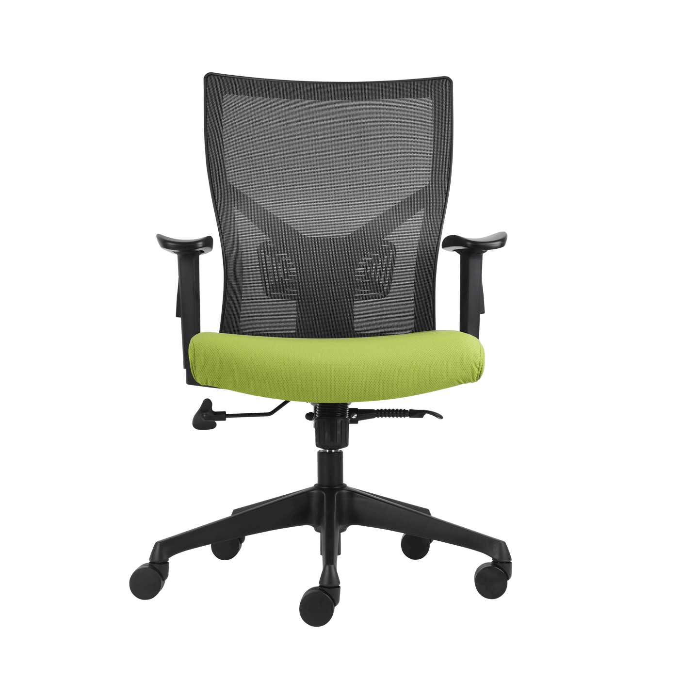 sillón ejecutivo de respaldo alto, respaldo tapizado en malla Flex, asiento tapizado en tela, brazos ajustables de poliuretano, mecanismo syncro de doble palanca, base piramidal de nylon color negro