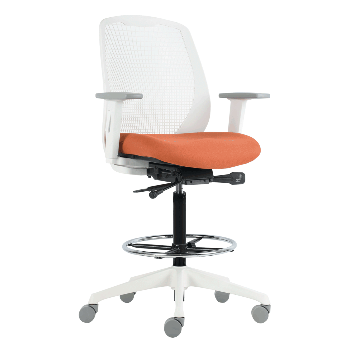 sillón para dirección de respaldo alto, pad de brazos en color gris, base de 5 puntas color blanco con rodajas de 65 mm color gris, asiento tapizado en tela respaldo ergonómico fabricado en nylon en su totalidad con diseño de perforaciones tipo malla, con soporte lumbar, fabricado en nylon de color blanco, mecanismo syncro autorregulable con cuatro posiciones de bloqueo y deslizamiento de asiento para mayor profundidad