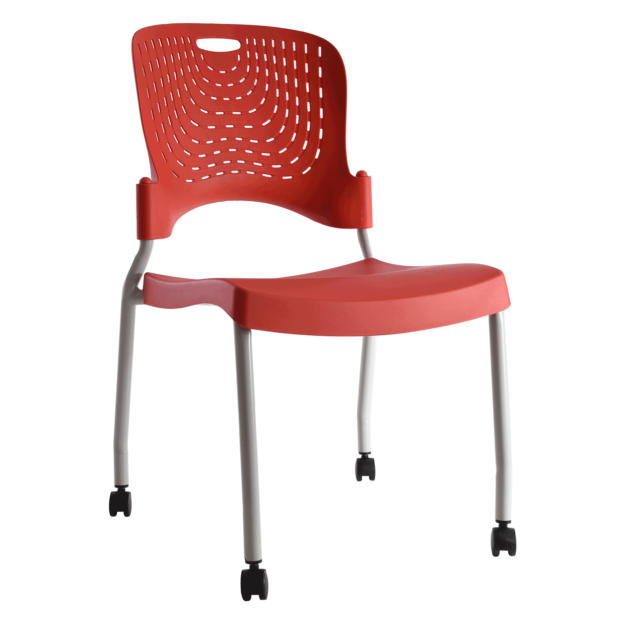 silla de 4 patas , estructura color gris y plásticos de colores, tapón con rodajas