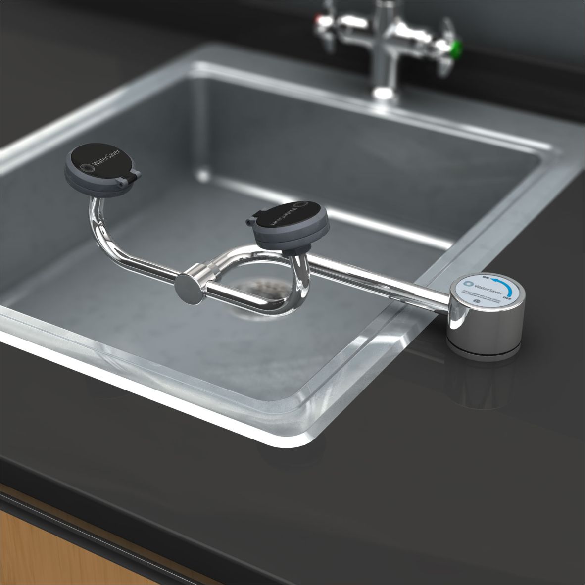 Aplicación: AutoFlow™ lavado de ojos / cara para montaje en mostrador al lado del fregadero. Al girar el conjunto del cabezal rociador 90 grados horizontalmente sobre el fregadero se activa el flujo de agua. La unidad permanece en funcionamiento hasta que el conjunto del cabezal rociador vuelva a la posición de almacenamiento y cierre la válvula.