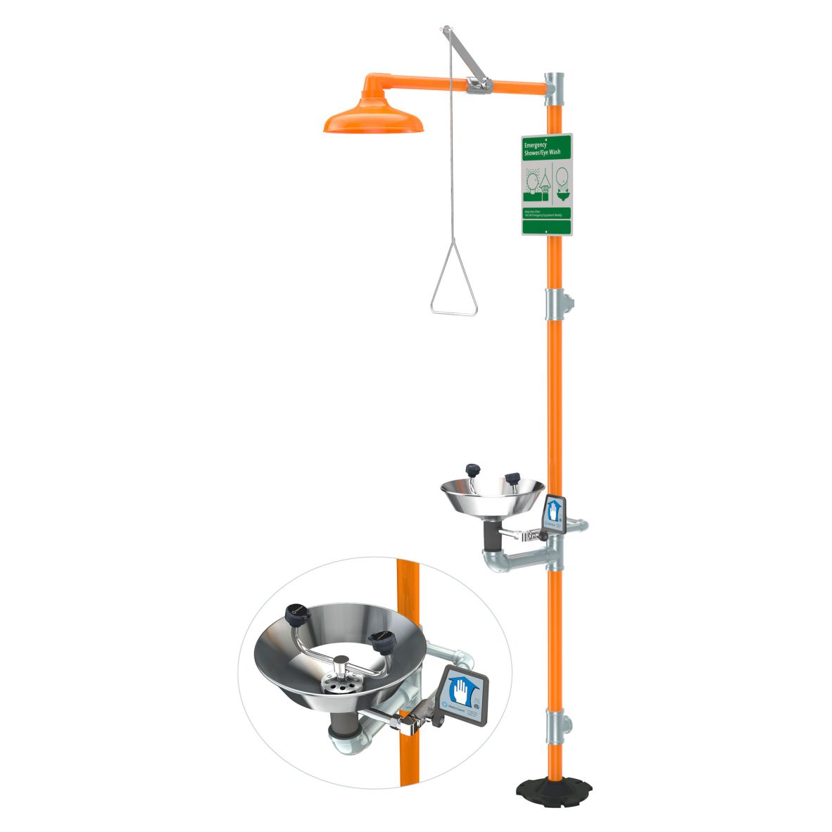 Aplicación: Estación combinada de lavado de ojos y ducha. Dos cabezales de salida tipo aerosol GS-Plus™ proporcionan una inundación de agua para enjuagar los ojos.