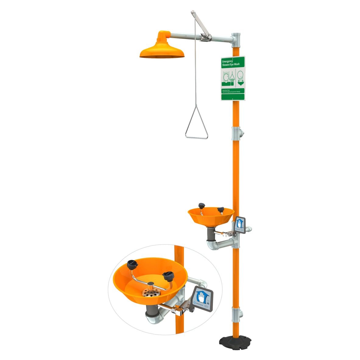 Aplicación: Estación combinada de lavado de ojos y ducha. Dos cabezales de salida tipo aerosol GS-Plus™ proporcionan una inundación de agua para enjuagar los ojos.